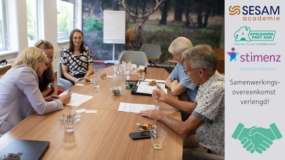 De samenwerking tussen SESAM Academie, Apeldoorn Pakt Aan en de SESAM Academie is opnieuw verlengd! Jan van de Werf (SESAM Academie) en Marian Kemper (bestuurder Stimenz) blikten samen terug op de jarenlange prettige samenwerking en ondertekenden de samenwerkingsovereenkomst voor 2025.