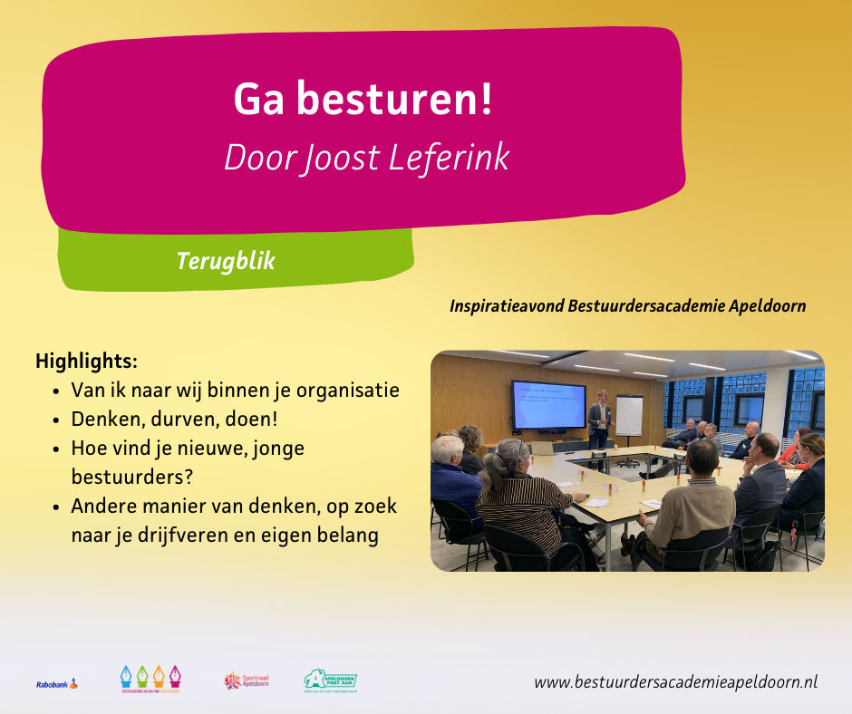 Op de Inspiratieavond kon je deelnemen aan de workshop 'Ga besturen!' van Joost Leferink. In de workshop werden meerdere tips en ideeën besproken over besturen.